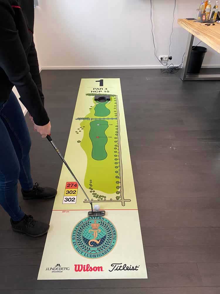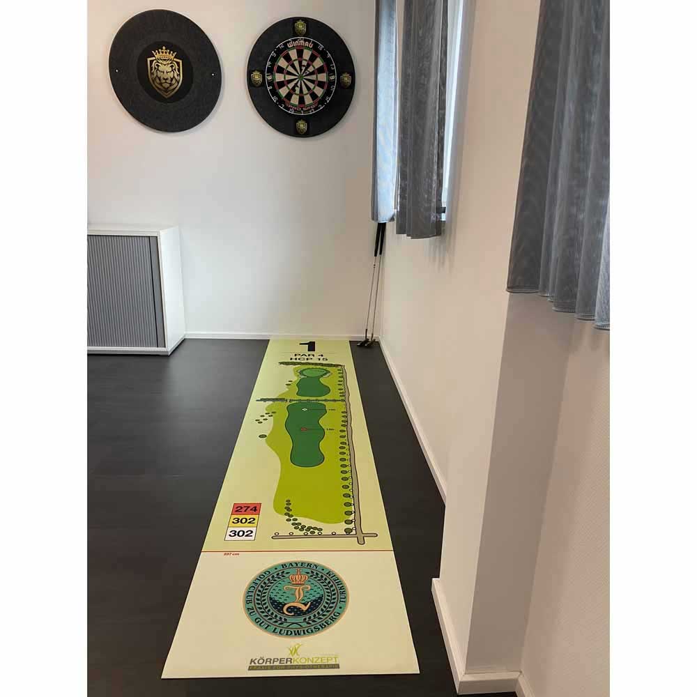 Die Matte schützt empfindliche Böden vor Spielspuren, Kratzer oder Einstiche der Pfeile im Boden. Üben sie das Putten zusammen mit dem Dartsport und machen die 2 in 1 Golf Putting- und Dartmatte zum Blickfang und Highlight in Ihrem Unternehmen.