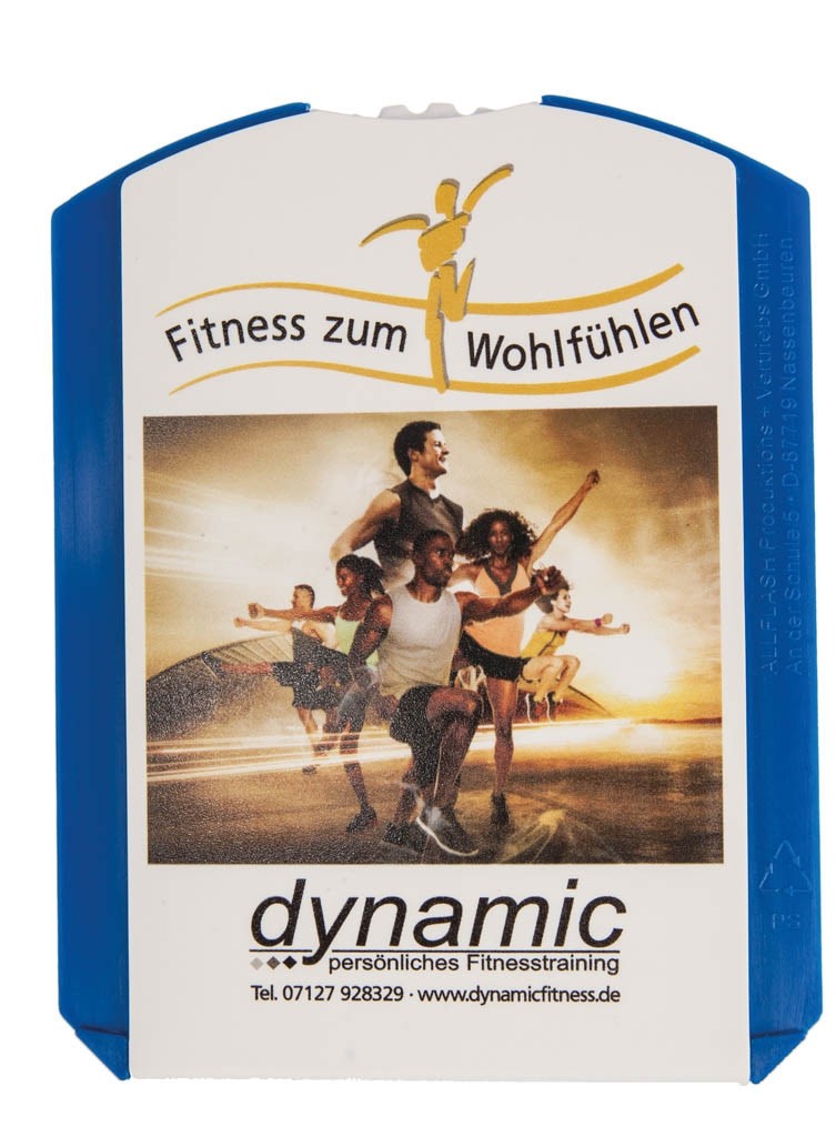 Die mehrsprachige Vorderseite ist blau, die Rückseite ist weiß und eignet sich somit ideal für eine Werbebotschaft.