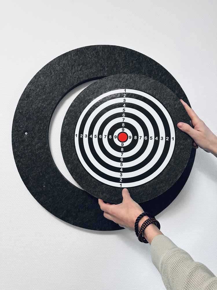 Schallschutz für Dartboards. Signifikante Reduzierung von Geräuschen im Raum hinter dem Dartboard. Eine stabile schallschluckende Montageplatte dient zur schallentkoppelnden Aufnahme des Dartboards. Der Catchring/Surround ist aus schallschluckenden Material für Steeldarts. Der Catchring ist sichtbar und kann nach Wunsch gestaltet werden. Unser Catchring wird über die Montageplatte gesteckt. Die Montageplatte ist mit 2 Senkbohrungen versehen und inkl. Befestigungsmaterial. Ist bei schwierigen Platzsituationen auch mit einem Cuttermesser zu bearbeiten.